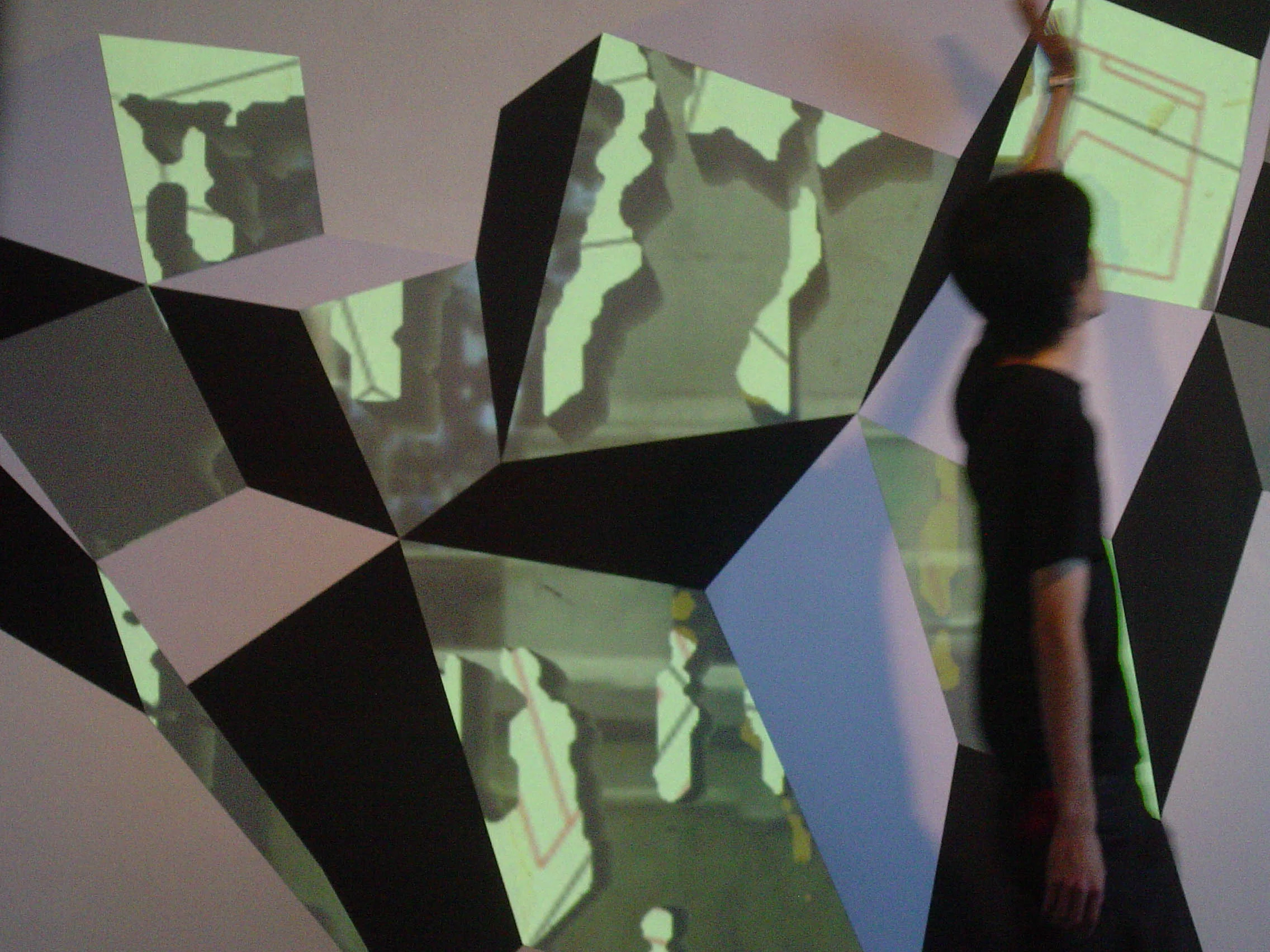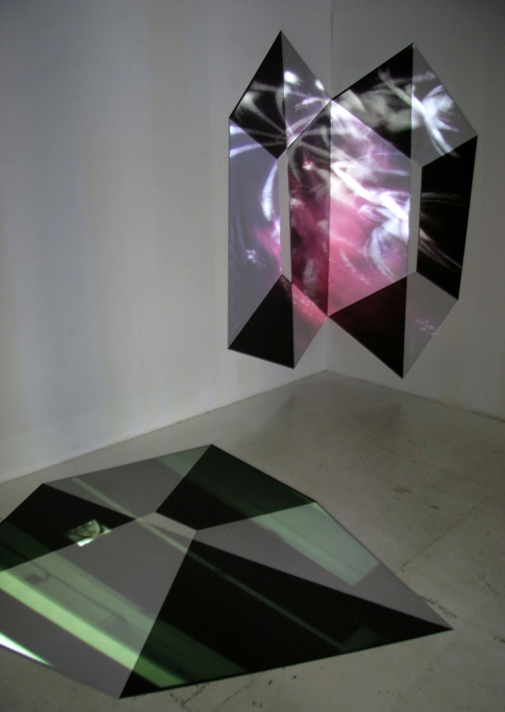 The artwork was constructed from irregularly shaped and alternating lighter and darker grey RPT material panels located at the corner of two walls resulting in an installation that appeared three dimensional and as if projecting into the viewer’s space, onto which the looped video sequence was continuously projected. RPT offers the potential for inventing with projection techniques on an architectural scale and my intention was for the distinctions between illusion and the reality of the viewer’s space to become blurred, with the artwork to appear to be a part of the real space experience of the viewer.